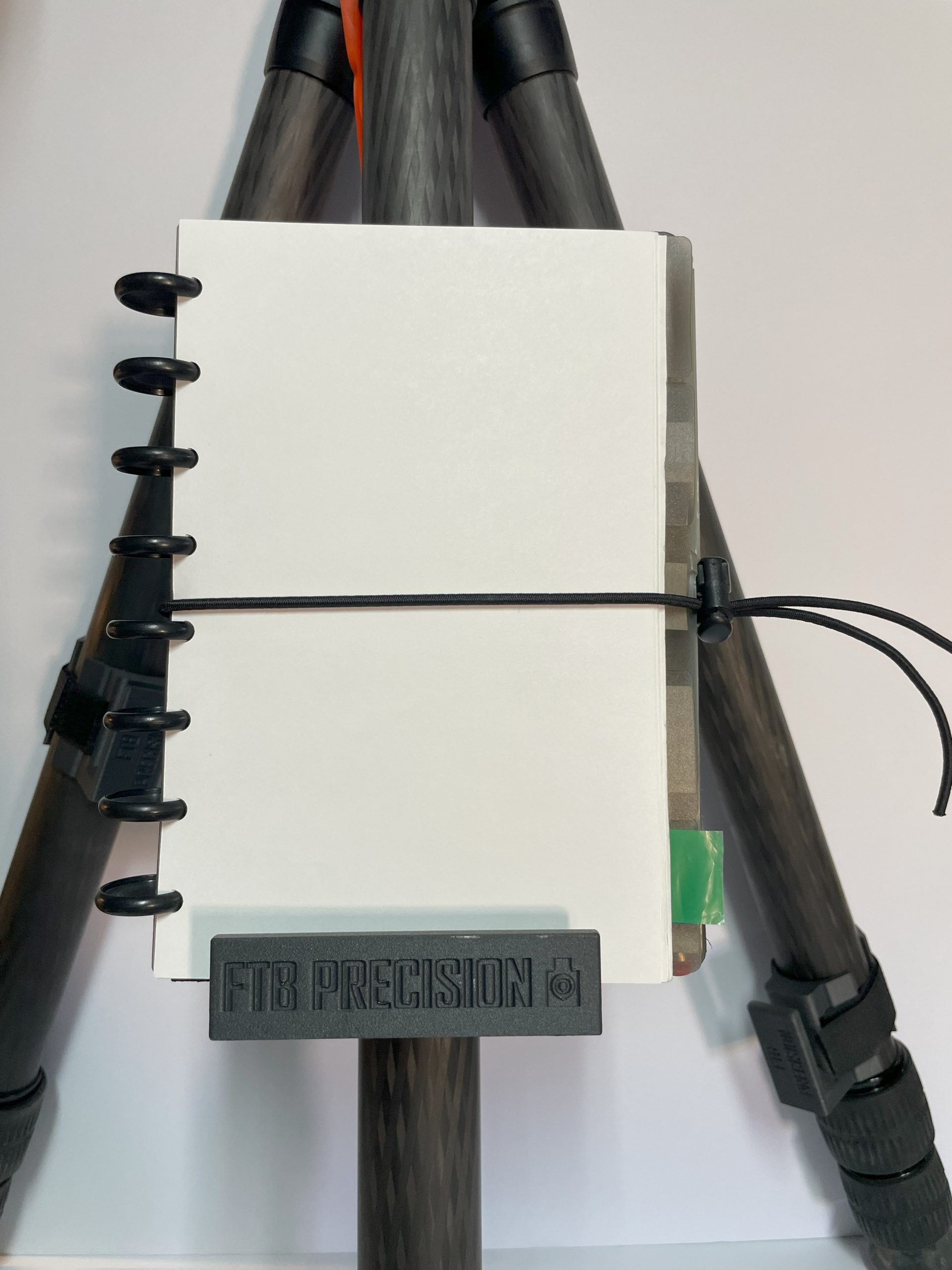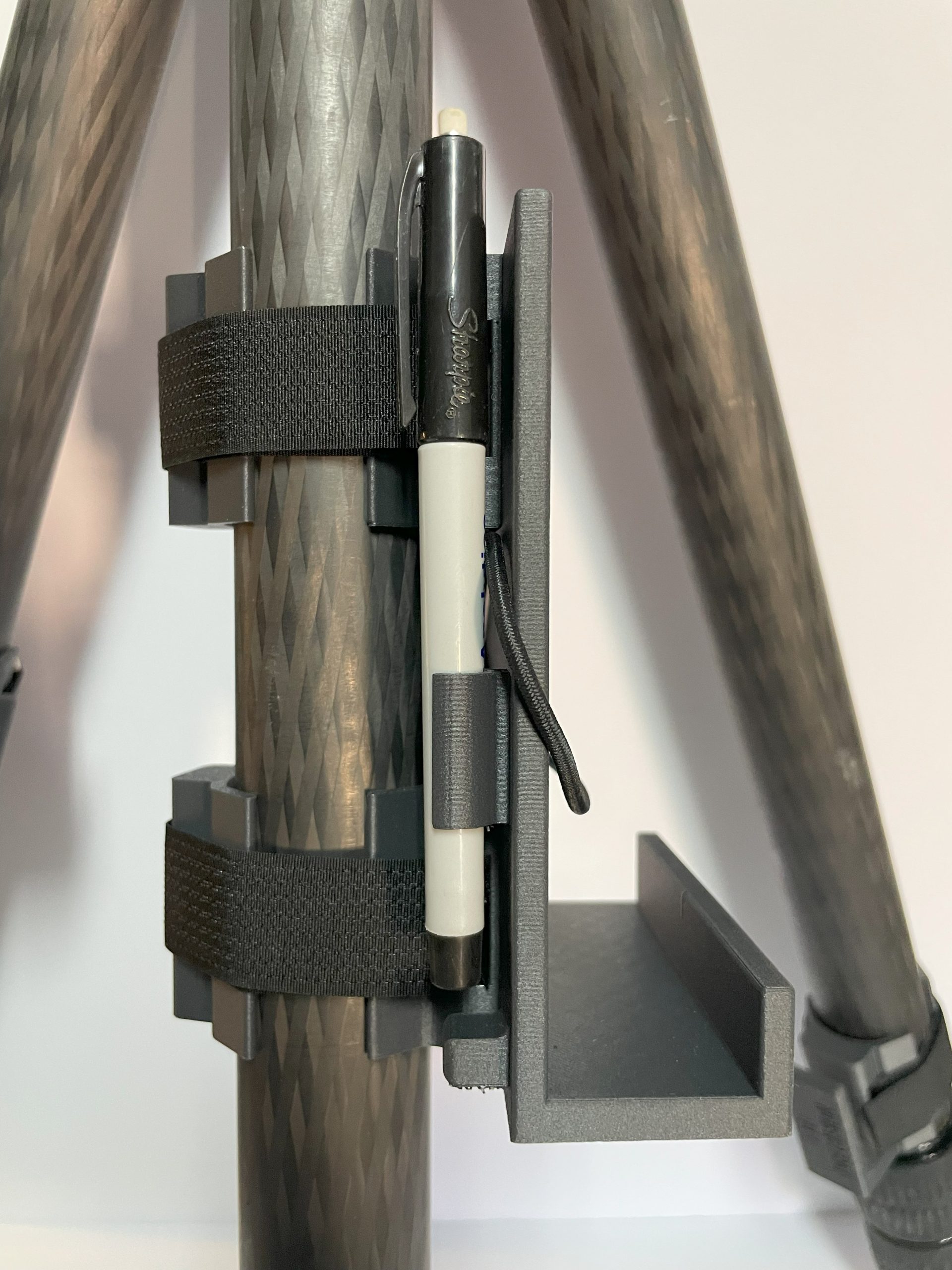The holder is equipped with two straps that secure it to a tripod leg. A stretch cord holds your data book in place, while integrated clamps on the back accommodate a pencil and a small marker-type pen, ensuring your writing tools are always at hand.